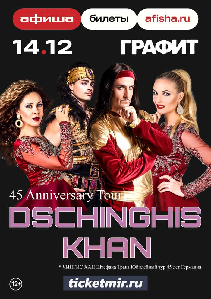 Безумная энергетика и красочность концертных шоу Dschinghis Khan сделали их неизменными участниками больших европейских фестивалей на протяжении всей многолетней карьеры. Большой сольный концерт в честь юбилея легендарной группы в воскресенье 14 декабря 2025 на большой и уютной площадке в Москве - на сцене культурного пространства «Графит», где есть всё необходимое для отличного концерта - вместительный зал с отличной акустикой, современным звуком и светом, большим видеоэкраном, удобными VIP-местами для тех, кто ценит отдельный вход и хорошую кухню - уникальная возможность спеть все золотые хиты вместе с группой и зажечь на танцполе!