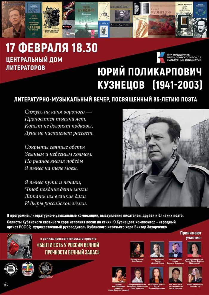 17 февраля в рамках просветительского проекта «Был и есть у России вечной прочности вечный запас» при поддержке Президентского фонда культурных инициатив в Большом зале Центрального Дома литераторов состоится литературно-музыкальная программа, посвященная 85-летию со дня рождения одного из самых масштабных и самобытных поэтов второй половины XX века, переводчика, литературного критика, редактора, педагога Юрия Поликарповича Кузнецова.