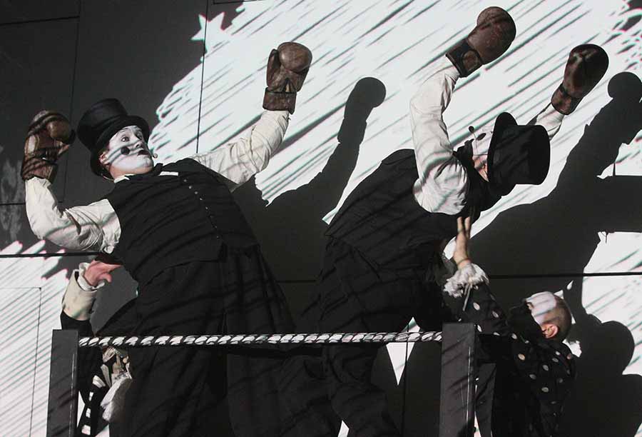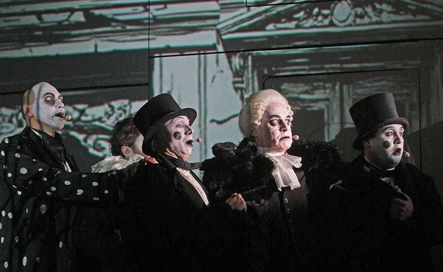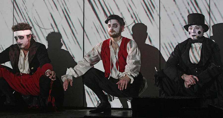 И только двое из них (Хлестаков и его слуга) отличаются от других героев красными тонами в одежде, остальные герои «живут» в черно-белом комиксе. На лице у героев толстый слой белой краски, гоголевские персонажи обезличены - их заменяют маски.