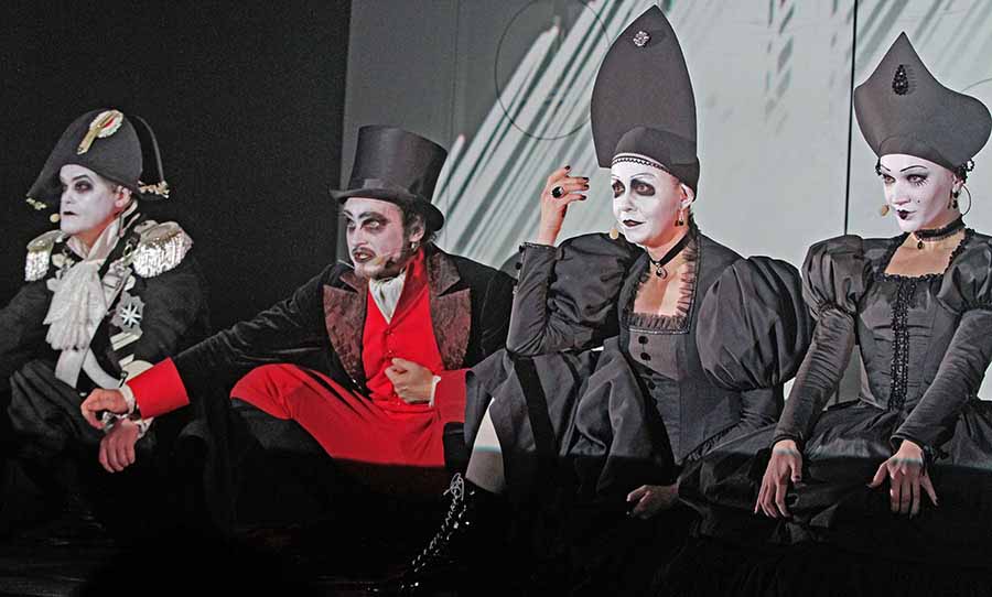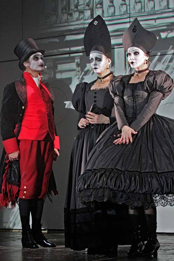Черно-белые краски неонуара, карикатурные персонажи готического комикса и гоголевские герои, читающие рэп – это и есть «Ревизор» Губернского театра. «Сцены представляют собой отдельные комиксы. Из героев я создавал своеобразных вампиров. Можно даже найти отсылки на семейку Адамс. Ну и как вы могли заметить, мы очень много работали с деталями», - рассказал журналистам художник-постановщик Антон Левдиков.