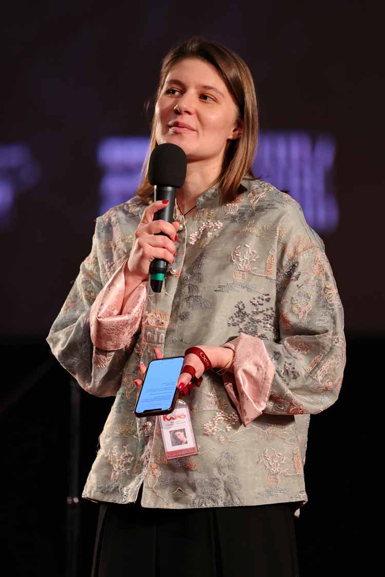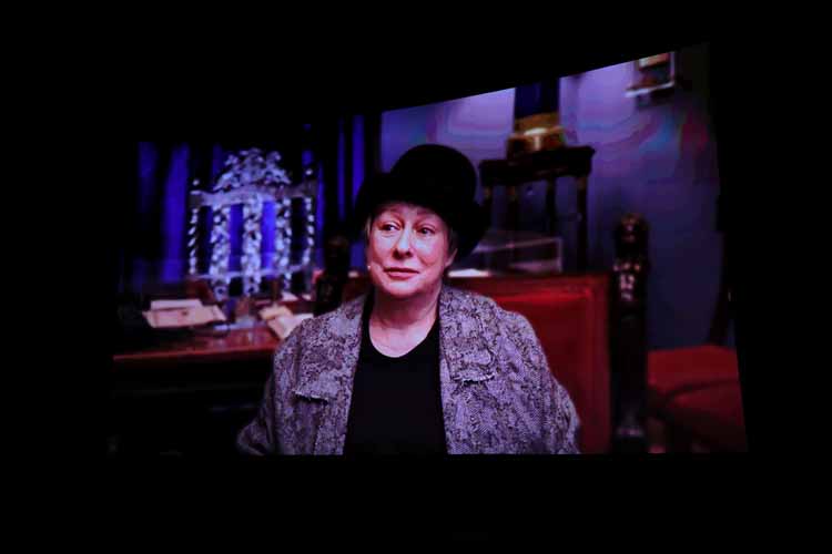 Ну, а непосредственно перед самым началом премьерного показа на огромнейшем экране «солировала» Мария Аронова, обратившаяся к собравшимся гостям по видео связи: «Показ спектакля «Мертвые души» в рамках проекта «Театр в кино» является для меня особенно важным событием. Это, с моей точки зрения, совершенно чудесная история. Потому что не каждый человек может попасть в театр, а в кино, как мне кажется, приходит гораздо большее количество зрителей. Для меня это огромная радость, что вы увидите наш, на мой взгляд, фантастический спектакль, который был выпущен нами к столетию театра Вахтангова. Особенностью этого спектакля является то, что все роли в нём играют два артиста: я, Мария Аронова, и мой сын, артист театра Вахтангова Владислав Гандрабура. Это настоящий Вахтанговский спектакль, в котором мы прячемся за разными масками».