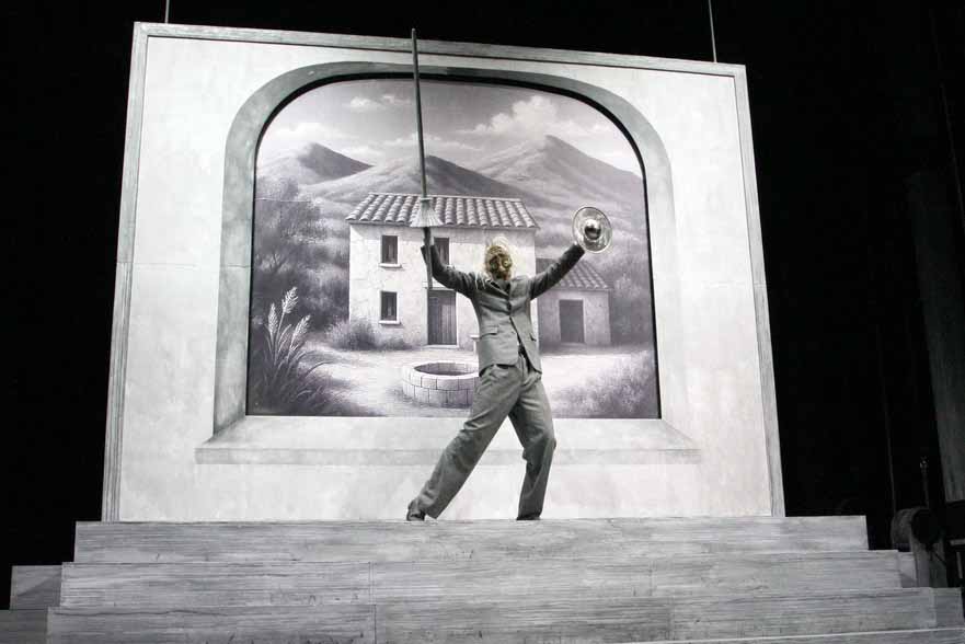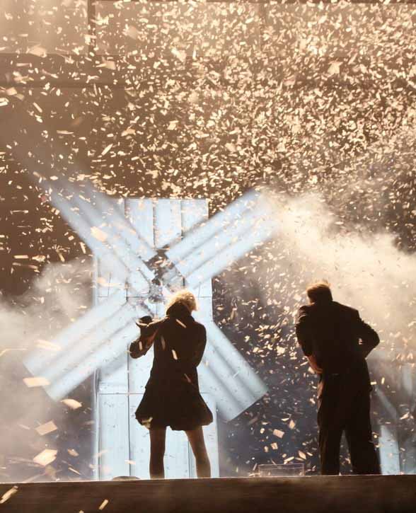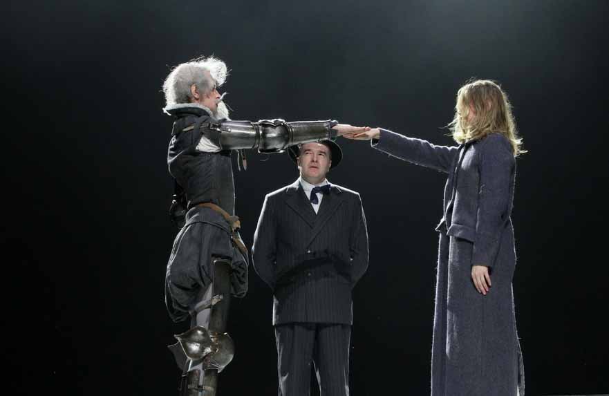«Главная проблема в спектакле не проблема Дон Кихота, а проблема вообще природы театра» - видимо ключевое, о чём хотел «поговорить» с публикой режиссёр Николай Рощин в своей постановке. Он же - сценограф и инсценировщик спектакля «Дон Кихот». Главная, на мой скромный вкус, заслуга Рощина, что в работе с артистами он использовал музыкальные термины – «настраивал звучание инструментальных и вокальных фрагментов». Зритель наблюдает за репетицией — довольно трагикомичным процессом, в котором есть и кино - роуд-муви про сегодняшних Санчо и Дон Кихота. А в конце «все рушится, летит, взрывается и падает». Это я про те самые огромные конструкции с подъемно-опускными механизмами, которые крутят сами актёры, уникальные и масштабные декорации, к которым, в финале присоединяются мельницы, без которых «Дон Кихот» невозможен.