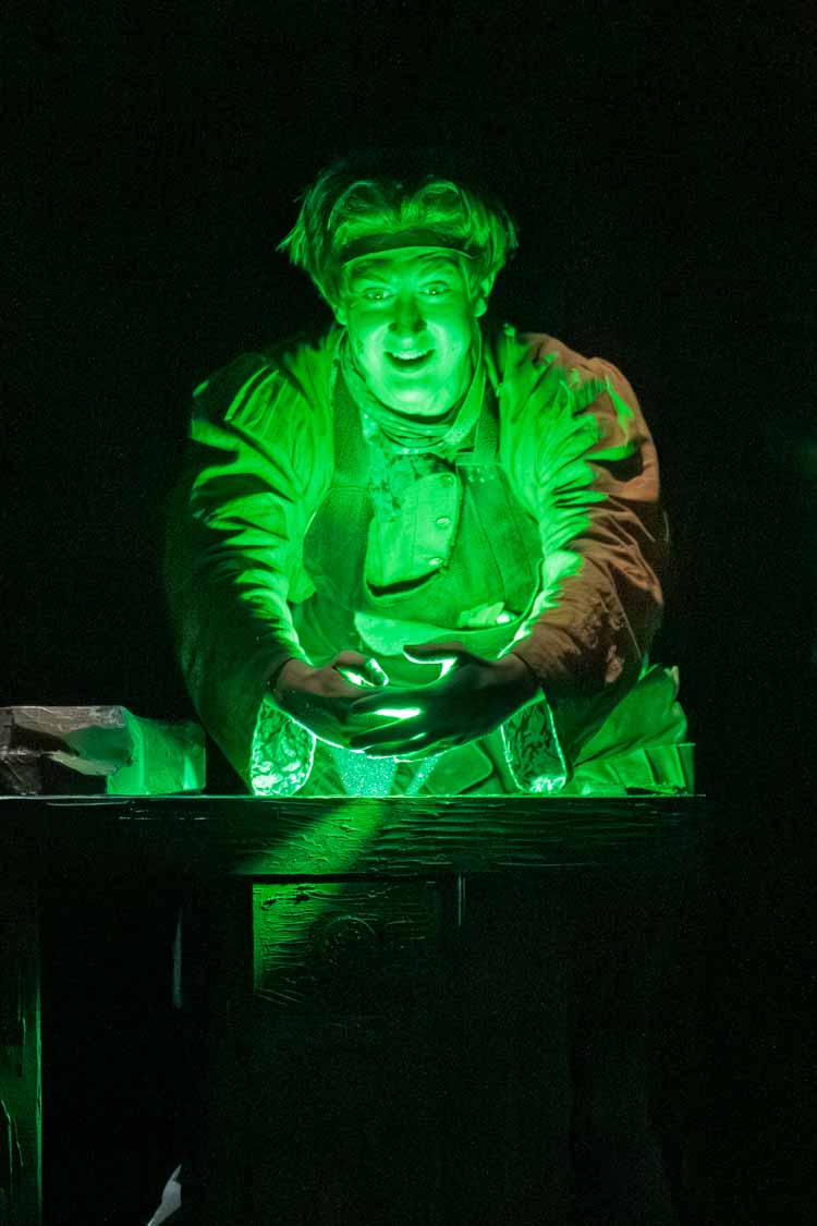 «Камнерез Данила не покладая рук трудится на шахте алчного Мормагона, возомнившего себя властелином всех гор в округе. Каждый раз, заслышав рассказы горняков про таинственную Хозяйку, бездушный самоуправец приходит в ярость. Его не пугают ни предостережения рабочих, ни сигналы природы, предвещающие большую беду. А его завистливая женушка Ядвига загорается желанием заполучить малахитовую шкатулку, главную драгоценность хранительницы природных недр. Хозяйка Медной горы хладнокровно наблюдает за страстями людей. Небезучастна она только к Даниле-мастеру, способному видеть прекрасное: секреты малахита открываются лишь ему» - такова «логистика» происходящего на сцене театра в премьерной постановке.