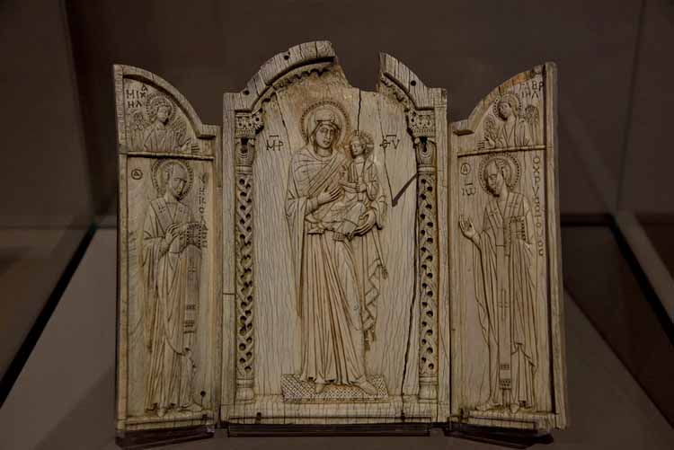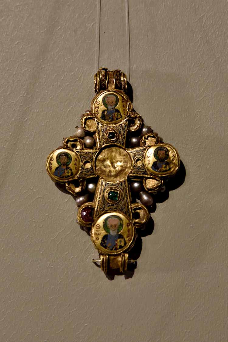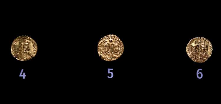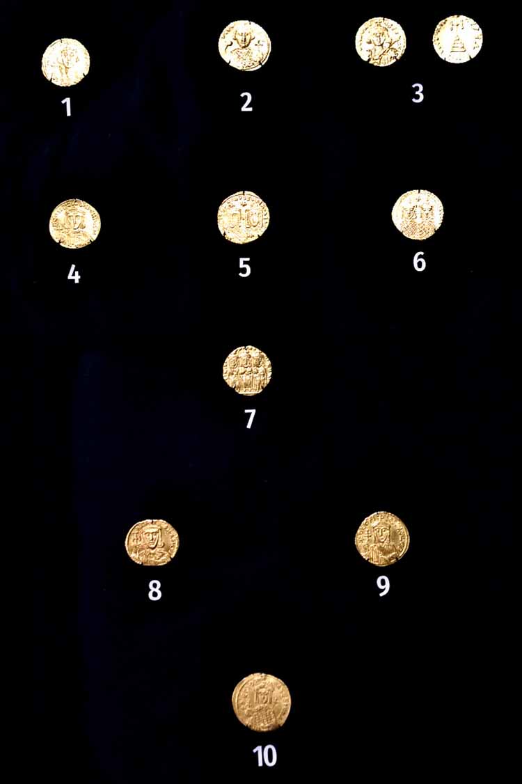 Основная часть экспонатов — золотые монеты различных хронологических периодов, чеканка которых впервые началась около 308–309 годов. Неизменный вес и высокая проба снискали им широкую популярность не только в Византии, но и в других государствах. Чеканка византийского золота продолжалась до 1367 года, когда ему на смену пришли представленные на выставке крупные серебряные монеты.