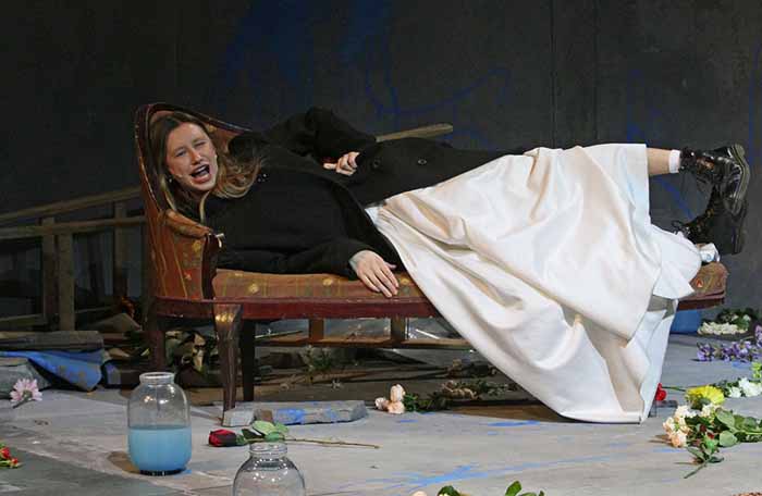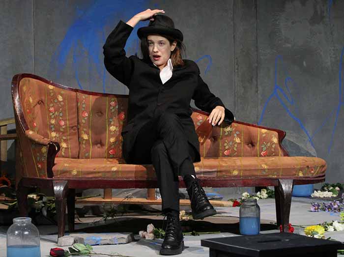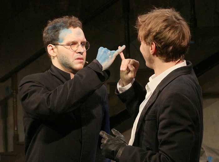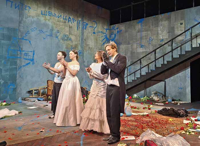Банки с синей краской, разбросанные цветы, крутая лестница, огромный нож, кассетный магнитофон, и разрисованные сцены - в таком антураже квартиры Рогожина проходит действие премьерного спектакля «Идиоты» на Малой сцене МХТ имени Чехова. Эта постановка – не что иное, как «рефлексия четырех персонажей»: Мышкина, Рогожина, Настасьи и Аглаи – на их попытке «хоть с одним человеком обо всём говорить, как с собой». Князя Мышкина играет сам Сергей Волков.