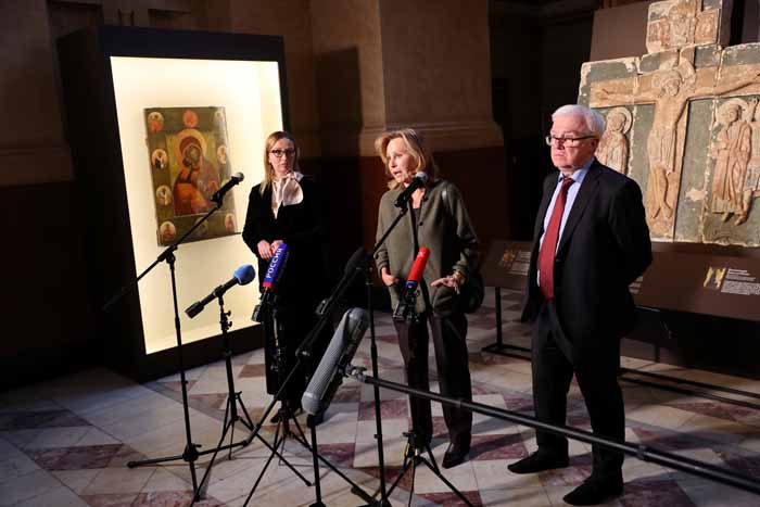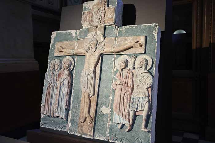 Также гости Исторического музея смогут увидеть «Святославов крест» – вырезанную из камня многочастную икону с изображением Распятия Иисуса Христа с предстоящими, происходящую из последнего белокаменного храма домонгольской эпохи – Георгиевского собора XIII века в Юрьев-Польском. Предание связывает появление креста с именем князя Святослава Всеволодовича, племянника Боголюбского, который по его завещанию продолжил заложенные Андреем Юрьевичем традиции белокаменного строительства.