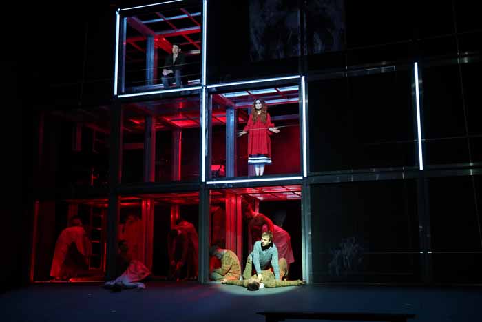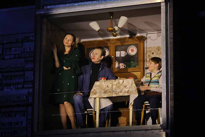 Главная «достопримечательность» спектакля - сцена разделена на две плоскости: горизонтальную и вертикальную. Конструкция из кубов-комнат, в каждом кубе по ходу действия появляется свой персонаж – своеобразный иконостас Лавра. В нем находится место и для погибшей Устины, и для любимого деда Христофора, и для Рассказчика, и для старца Никандра.
