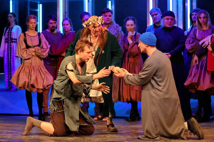 В постановке бережно сохраняется главное — «ритмика текста», а диалоги актеров выстроены по тем же принципам: от современного русского языка резкие переходы к старославянским оборотам.