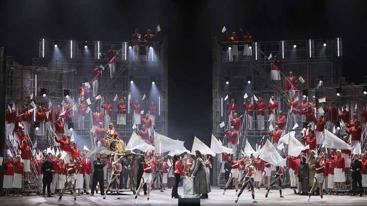 Стилисты Большого театра конечно-же потрудились на славу. Одеть «толпу» (серо-черная) и «физкультурников» (красно-белая) в такие роскошные наряды – это дорогого стоит. А есть еще и видеопроекции, которые появляются на протяжении всего действия, крупными планами демонстрируют лица иноземных принцев, которых отправляет на казнь Турандот.
