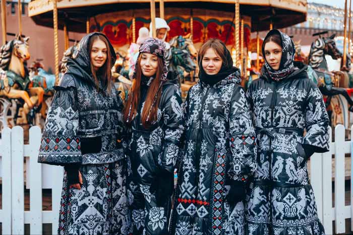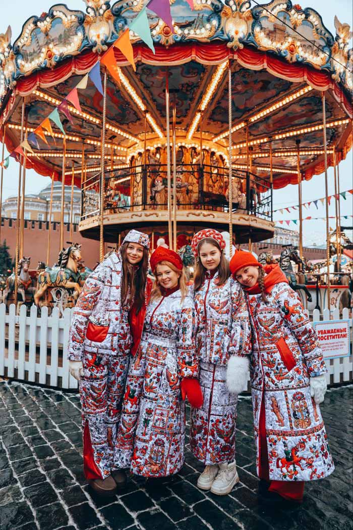 Наряды из новой коллекции Душегреи, гармонично сочетающие русский культурный код и современные силуэты, великолепно вписались в антураж новогодней Москвы, в котором вековая архитектура сияет в калейдоскопе гирлянд.