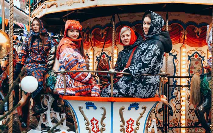 За две недели до Нового года бренд Душегрея в историческом центре Москвы визуализировал легендарный хит «Разноцветные ярмарки»: 18 девушек в оригинальных нарядах в современном русском стиле устроили праздничный флэшмоб в Парке Зарядье, покатались на карусели на Красной площади, раскрасив столичную зиму красотой и национальным колоритом.