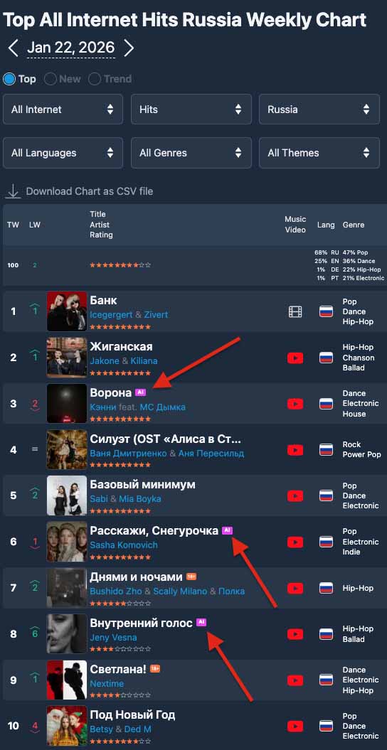 Впервые в истории российской популярной музыки в TOP 10 этого чарта вошли сразу ТРИ трека, сгенерированные с помощью систем искусственного интеллекта: