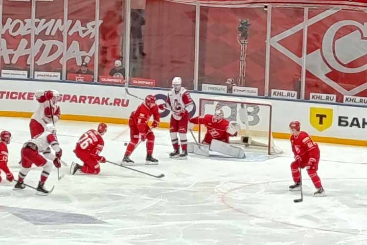«Спартак» стартовал по-хозяйски: уже на 8-й минуте «Мегаспорт» лицезрел чёрный каучуковый диск в воротах Исаева. Трио третье звена красно-белых Локхарт– Рябов – Лукьянцев сообразили «на троих», а автором гола стал первый. «Локомотив» ответил своим взятием хозяйских ворот, шайба на счету Красковского. А затем гости начали удаляться и хозяева снова вышли вперед. Пивчулин с пятака отправил хоккейный снаряд в ворота «железнодорожников».