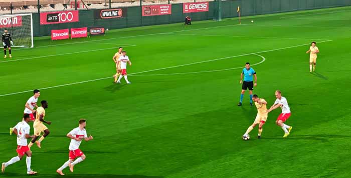 «Пюник», в свою очередь, также имел момент – здесь уже спартаковскому стражу ворот Максименко пришлось дважды вступать в игру: мастерски среагировал на удар со средней дистанции, а затем в невероятном «гимнастическом этюде» спас команду после добивания.